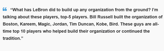 当时谈到为什么不选詹姆斯进入前七,皮尔斯的解释是:“勒布朗建立任何一个王朝了吗?我提到的这些球员,比尔-拉塞尔建立了波士顿王朝,贾巴尔、魔术师、乔丹、邓肯、科比这些历史前十的球星们,都对球队王朝的建立做出巨大的贡献,或者延续了球队的传统。”
