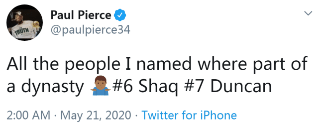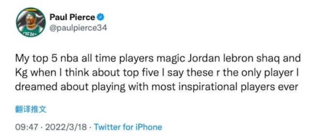 这一次谈到历史前五,皮尔斯没有排顺序,但两年前谈到这个话题,皮尔斯按顺序列出来依次是乔丹、贾巴尔、拉塞尔、魔术师和科比,随后,他在个人社媒上补充了第六位和第七位的人选。排名第六的是奥尼尔,排名第七的是邓肯。也就是说,詹姆斯没有进入前七。