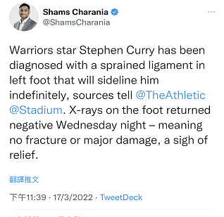 来源:JRS直播03-18 11:40JRS直播03月18日讯 受伤的库里传来最新的消息,这是根据Shams的报道显示,库里左脚韧带扭伤,无限期缺阵,不过昨晚的X光检查确认没有骨折或任何重大损伤。