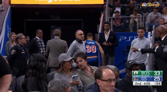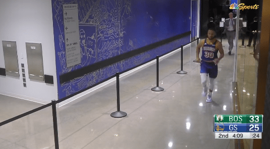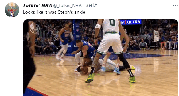 离场前库里上场13分钟4投1中拿到3分2助攻1篮板以及4失误,从现场画面来看,在一次无球争夺时,库里被斯玛特压伤脚踝,库里在场边一瘸一拐,之后被换下,然后返回更衣室接受检查,值得一提的是,库里是一路跑回更衣室,但愿他的伤势无大碍。