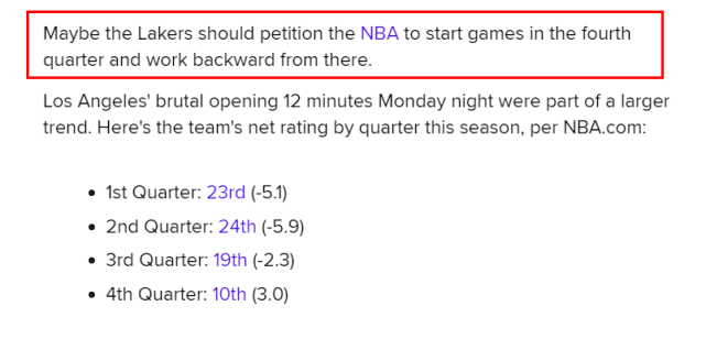 赛后,安东尼说了这么一句话:“如果把第一节拿掉,我们会赢下这场比赛,我们总是比赛一开始就给自己挖下大坑。”湖人第一节输了21分,后三节一共赢了10分。这已经是湖人连续第二场首节落后至少20分了。此前对太阳一战,他们首节输给对手26分!