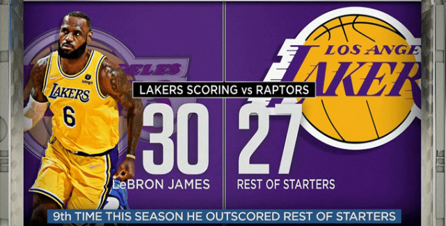 湖人昨日不敌猛龙一战中,詹姆斯得到30分。美媒指出,这是詹姆斯本赛季第9次得分超过其他4位首发的总和,威少14分、蒙克8分、里夫斯3分、斯坦利-约翰逊2分,湖人其余4位首发总计只得到27分。詹姆斯在比赛中多次发怒,湖人在后半程奋起直追,但由于第一节挖的坑太大(单节输了21分),他们还是以11分之差输给猛龙。