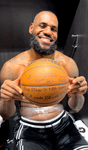 詹姆斯坐在更衣室,双膝包裹着厚厚地冰袋,背部也在冰敷;打造签名球时十分认真,一边看手机一边写字,在纪念球上写上10000分、10000助攻、10000篮板以及2022年3月13日等字样,最终签名并且画上王冠的表情,完工之后老詹冲着篮球吹气,然后双手抱球并且冲着镜头大笑。