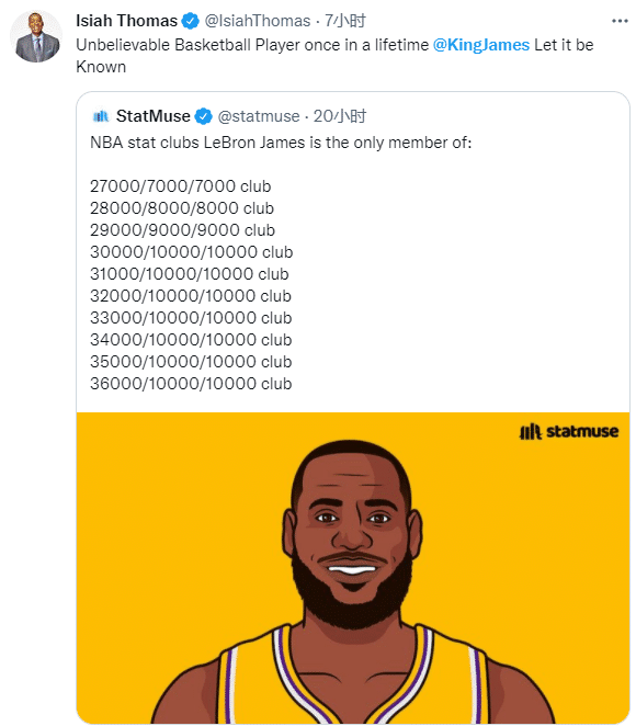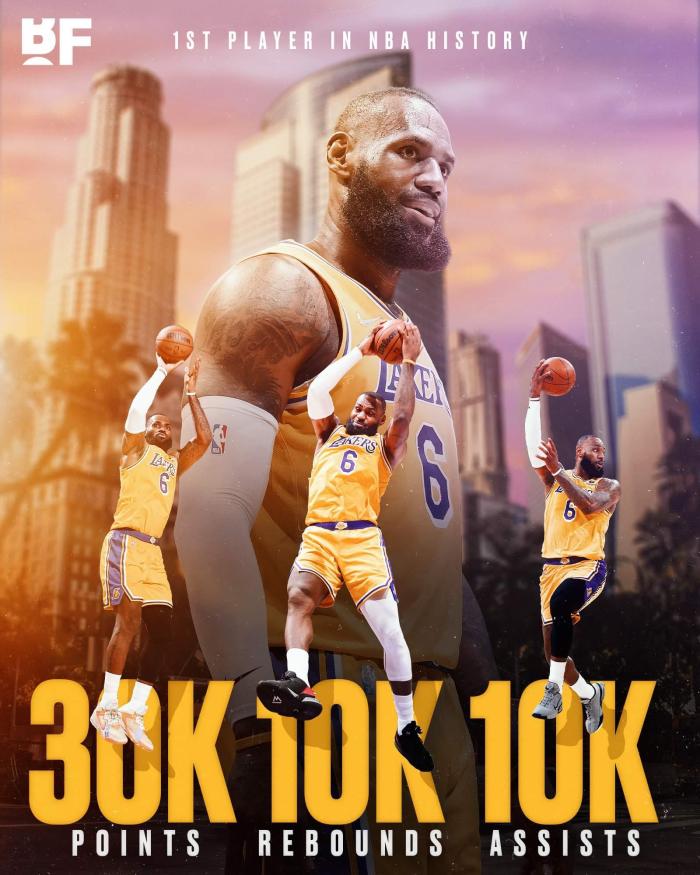 美媒StatMuse还晒出詹姆斯包揽十大历史第一神迹——27000分7000助攻7000篮板、28000分8000助攻8000篮板、29000分9000助攻9000篮板、30000分10000篮板10000助攻、31000分10000篮板10000助攻以及32000分10000篮板10000助攻、33000分10000篮板10000助攻、34000分10000篮板10000助攻、35000分10000篮板10000助攻和36000分10000篮板10000助攻。