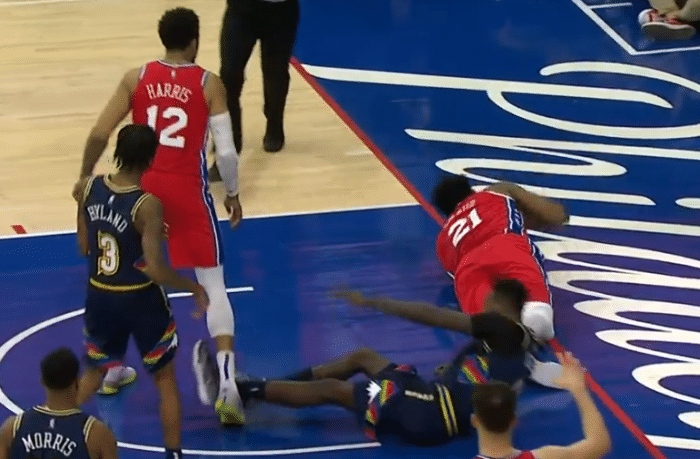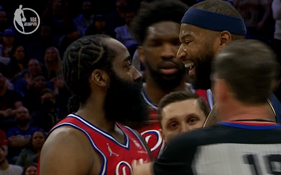 76人双巨空砍58分!哈登准三双与考辛斯互喷,恩比德遭恶犯险受伤