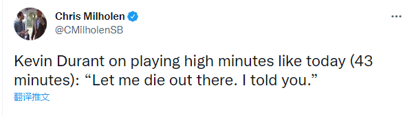 赛后杜兰特拥抱欧文开心庆祝,之后两人在球员通道中勾肩搭背一起走回更衣室;谈到自己出战42分钟,杜兰特霸气回应:我告诉你们,让我死在球场上吧。