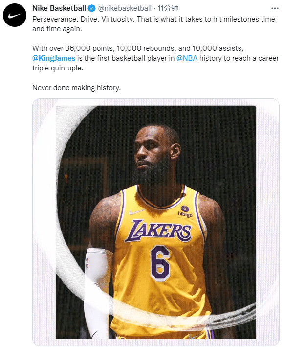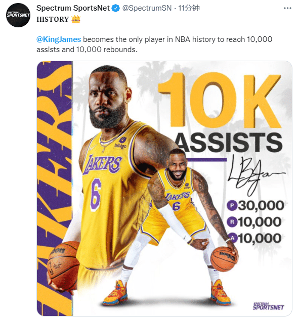 湖人官方祝贺詹姆斯创纪录,晒图并且配文:第一个,仅有的一次,国王;湖人官方还晒出詹姆斯助攻安东尼的视频,恭喜老詹正式达成10000次助攻里程碑。
