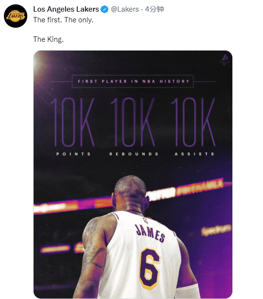 在湖人和太阳比赛中,詹姆斯正式达到36000分+10000助攻+10000篮板的历史第一伟大神迹,成为NBA 75年历史第一位30000+10000+10000的球员,詹姆斯创纪录瞬间引热议,众美媒纷纷晒图祝贺,湖人官方盛赞:国王,历史第一且唯一一人。