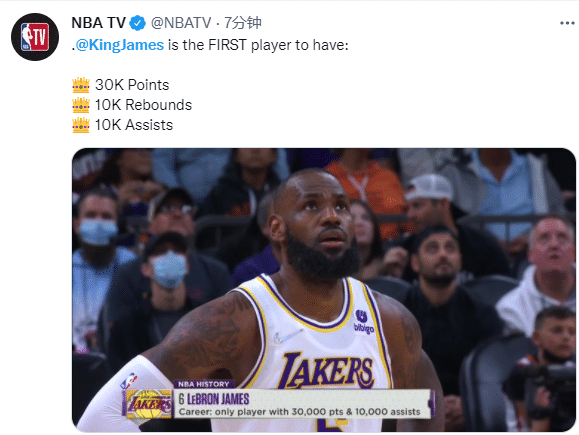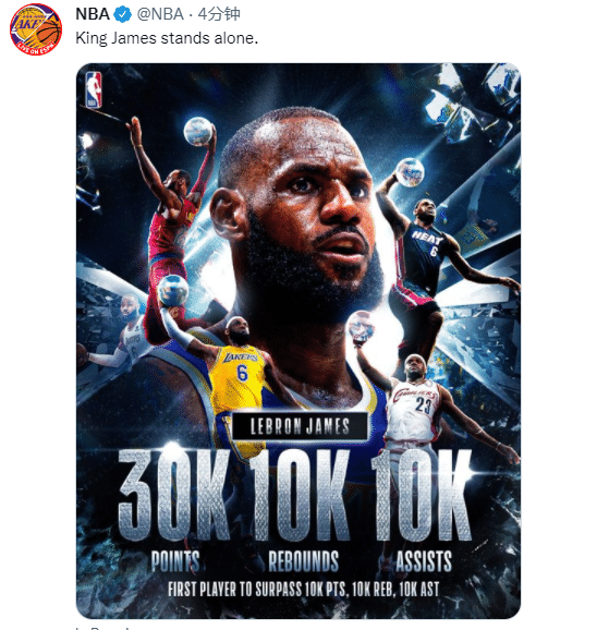 在湖人和太阳比赛第二节,詹姆斯助攻安东尼得分,从而正式达成得分、篮板和助攻三项数据全都破万的伟大神迹;NBA官方第一时间晒詹姆斯3万+1万+1万的历史第一纪录,配文写到:King 詹姆斯独领风骚。