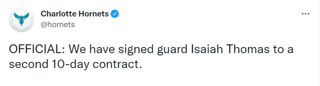 数据显示,小托马斯在第一份10天合同里为黄蜂出战3场,场均13.8分钟能贡献9.7分2篮板1.7助攻,投篮命中率43.5%,三分命中率42.9%,罚球命中率100%。这3场比赛,黄蜂1胜2负。本赛季早些时候,小托马斯曾和湖人、独行侠签过10天合同。