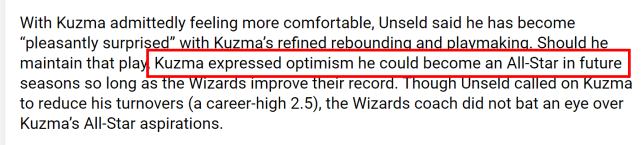 库兹马相信只要奇才继续提升战绩,他有望在未来的赛季里成为一名全明星球员。奇才主帅小昂塞尔德虽然希望库兹马减少失误,但也承认库兹马已经打出高水准,并相信全明星目标有望在不久的将来实现。