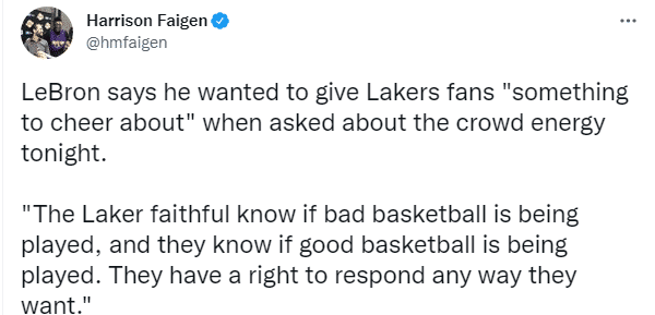 本场比赛,上半场最后时候,有些湖人球迷不满表现而发出嘘声,但下半场,詹姆斯疯狂砍分,让湖人球迷疯狂庆祝以及欢呼。