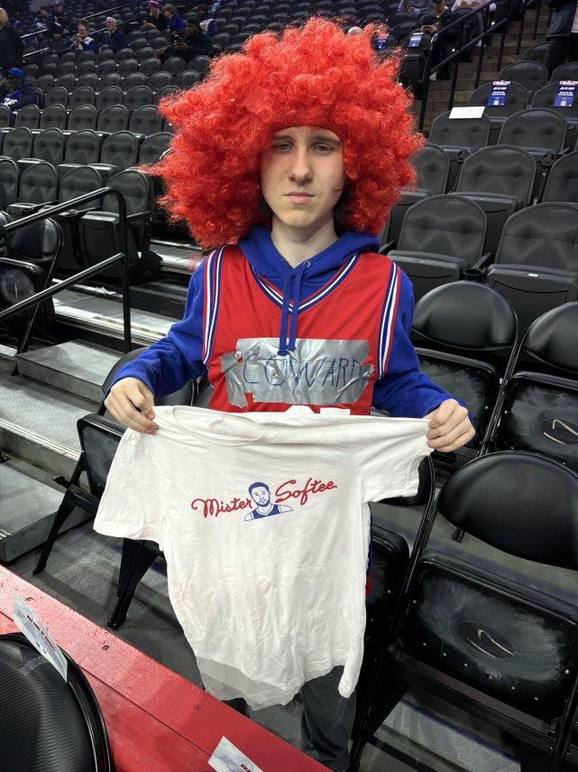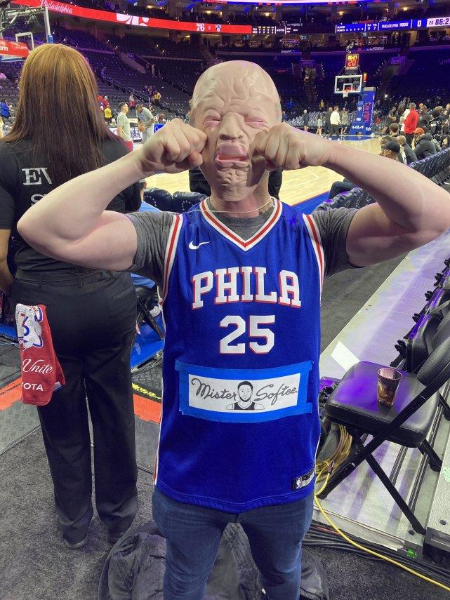 现场球迷不但嘘西蒙斯,还用各种海报和球衣变装来调侃西蒙斯,嘲讽他是巨婴和懦夫,心理承受能力也很差。