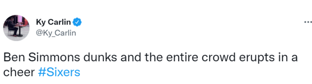 西蒙斯每次碰到球,主场球迷都会爆发出巨大的嘘声。有趣的是曾经有短暂的一段时间,嘘声变成了欢呼,前方记者报道原因是西蒙斯突然扣了个篮,这个举动让球迷爆发出欢呼,但只是一瞬间,很快又变成嘘声。