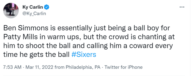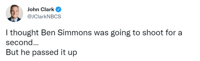 前方记者报道称,西蒙斯在场上主要扮演了米尔斯的球童角色,米尔斯练习三分投射时,西蒙斯一直给他喂球。76人记者写道:“我以为本-西蒙斯要投篮了,结果他把球传掉了。”显然,他还是在调侃当初西蒙斯在季后赛篮下不进攻却传球的一幕。