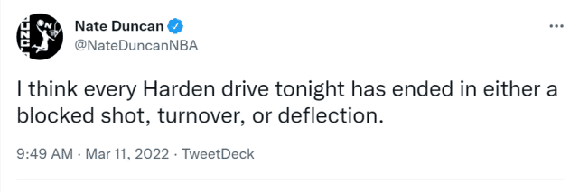 来源:JRS直播03-11 15:14JRS直播03月11日讯 ,哈登今天的表现也引起大量吐槽。有美记表示,哈登今天的突破要么被封盖,要么失误,要么就是被对方干扰掉了。事实也的确如此,哈登全场的3个运动战进球都是三分球,他的两分球10投0中,被对方帽了6个。