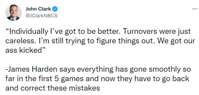 “今晚对我们有好处,我们被踢了屁股,”哈登总结道。哈登还表示这场失利给了76人一个警钟, 并告诉他们需要在哪些方面下功夫。