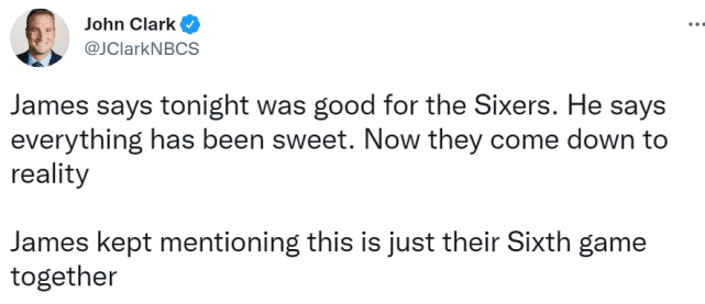 就像哈登说的那样之前5场比赛太甜蜜,但第6场比赛很快将费城球员拉回到现实中来。哈登也强调这只是他们合作的第6场比赛,显然,他认为无论是自己还是76人都有继续提升的空间。