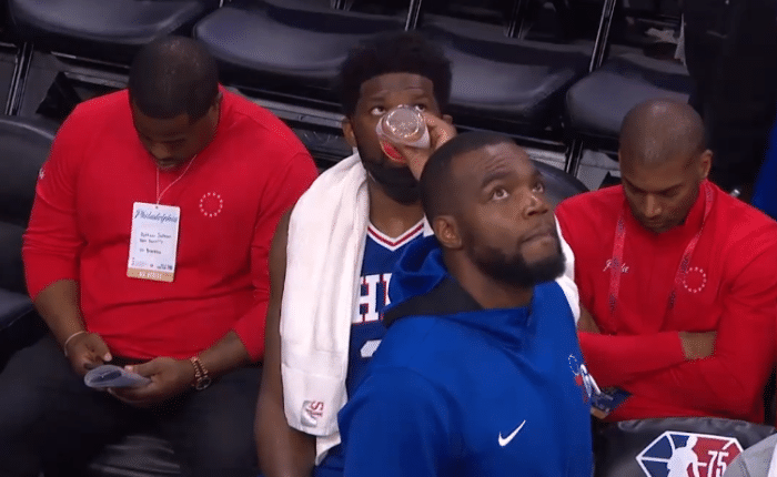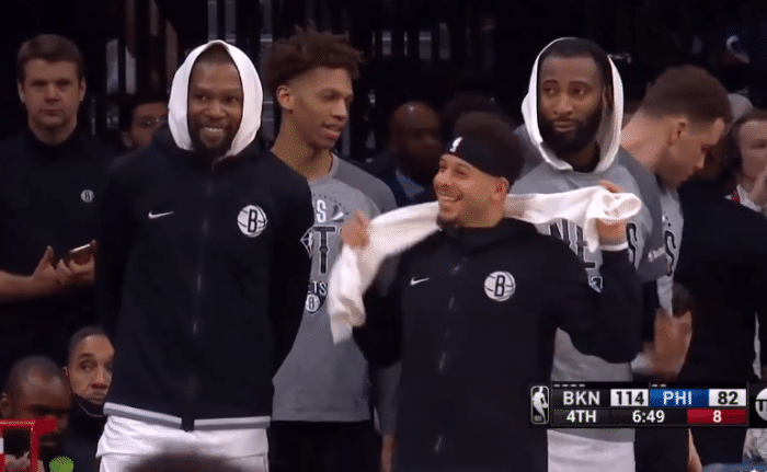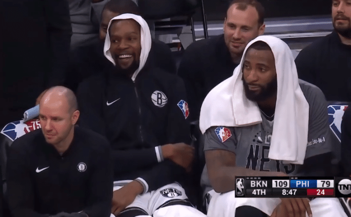 篮网全场吊打76人,第一节40-23领先17分,第二节32-28、第三节30-19早早打花比赛,末节杜兰特不用上场,镜头多次拍到杜兰特咧嘴大笑,庄神坐在替补席笑得前仰后合,西蒙斯也哈哈大笑,篮网赢球太开心。