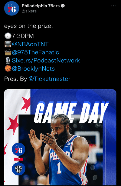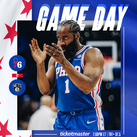 这场比赛之前,76人在官方预热,他们发布了比赛时间、地点、转播平台等,赛事预告的海报,用了哈登这张“死亡凝视”的照片,上面还有大幅的“比赛日”,用来宣传和预热这场比赛。