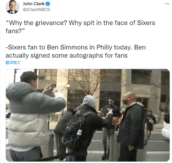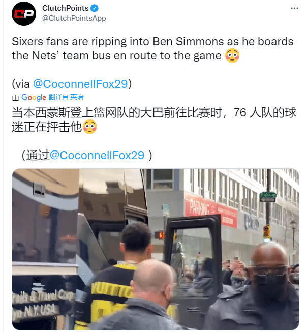 篮网入住的酒店被当地球迷包围,西蒙斯离开酒店时,现场有很多球迷质问以及怒吼西蒙斯,在安保人员的护送下,西蒙斯上了球队大巴,现场显得很混乱;抵达76人主场,下车后有些球迷问西蒙斯要签名,与此同时也有球迷质问西蒙斯:为什么感到委屈?为什么蔑视76人球迷?你不知道曾在这里呆了5年吗?