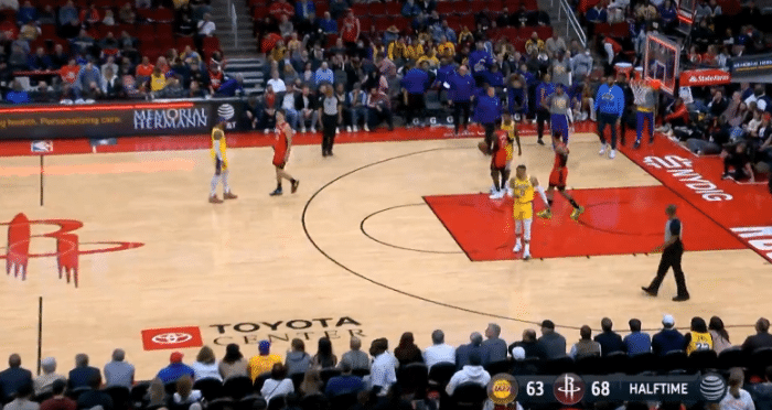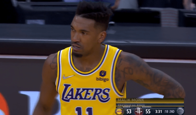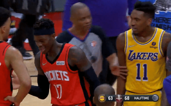 湖人和火箭上半场最后时刻,詹姆斯连续在禁区上篮不中,施罗德轰进追身三分,之后威少助攻里夫斯回应三分,湖人半场63-68落后5分,上半场结束后,施罗德和蒙克发生争执,蒙克貌似很生气,裁判赶紧拉开蒙克;施罗德面对旧主,半场替补上场10分钟5投3中拿到10分4助攻1篮板。