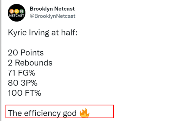 美媒Brooklyn列出了欧文的上半场数据:除了20分,他的命中率71%,三分命中率80%,罚球命中率100%,并称赞他为效率之神。篮网上半场20助攻,创赛季至今的半场新高,而且全队只有4次失误。篮网半场领先26分,创造了本赛季篮网半场领先的第二大分差。