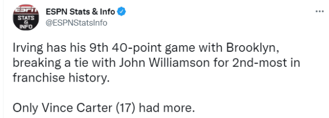 6.这是欧文篮网生涯的第9场得分40+的表现,他已经超过约翰-威廉姆森,独占队史第二。篮网队史上只有卡特(17次)比他多。