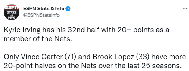 4.欧文上半场就得到20分,下半场得分也超过20分,欧文篮网生涯已经33次半场至少20分,成为队史近25年来的第二人,卡特曾71次半场20分,大洛佩斯也是33次,欧文追平了大洛。