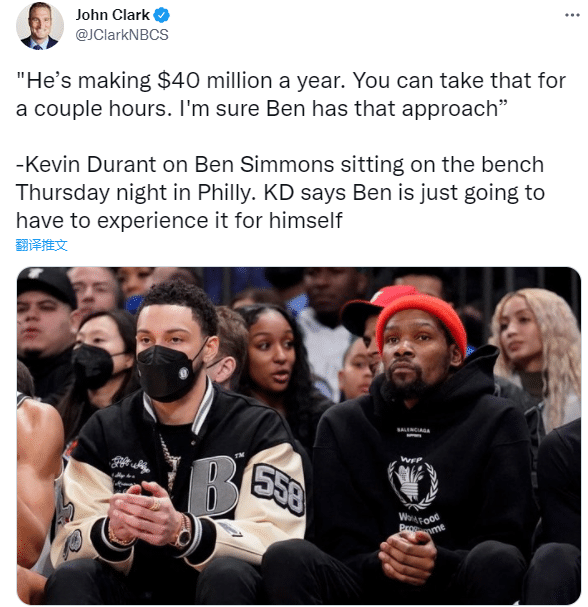 赛后谈到西蒙斯重返费城将遭狂嘘,杜兰特表示西蒙斯需要亲自去费城体验:西蒙斯一年赚4000万,我认为他绝对能在那样的环境下忍受几个小时,我确定他没问题。
