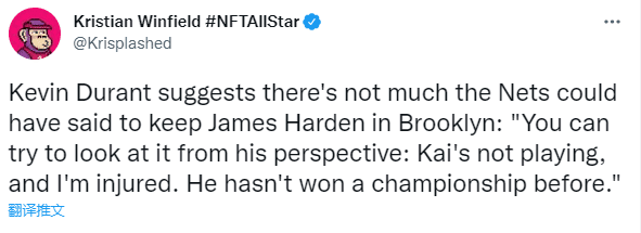 再次谈到哈登离开篮网,杜兰特表示:你可以试着从哈登的角度来看,欧文没有上场,而我受伤了,他以前从未夺过总冠军。