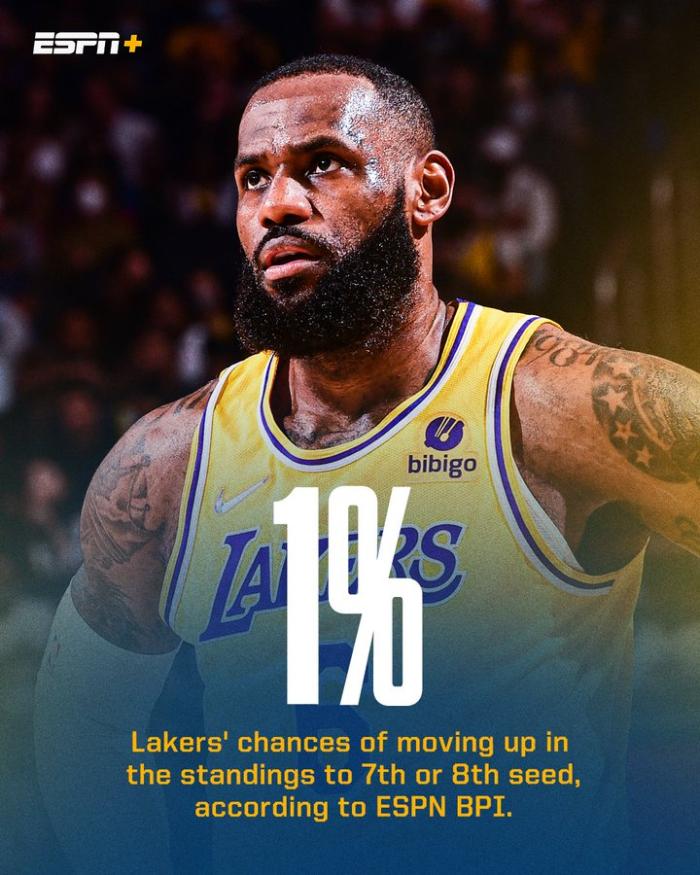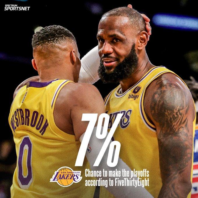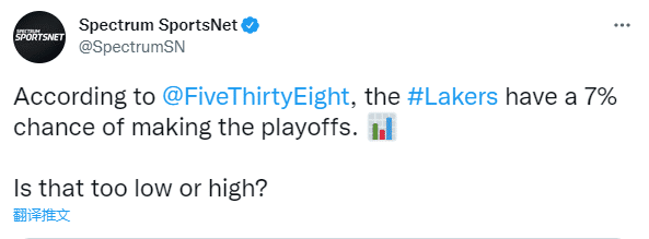 根据FiveThirtyEight分析,目前湖人进入季后赛的概率仅仅只有7%,美媒Spectrum SportsNet发推反问:这个概率高了还是低了?