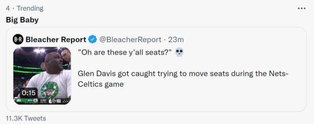 篮网和绿军一战冲上全美热搜的第一位,杜兰特轰下37分6篮板8助攻,解锁25000分里程碑,塔图姆轰下54分,生涯4次50+追平伯德,并列绿军队史第一,最终绿军以6分优势取胜。值得一提的是就在这场比赛中的场边尴尬一幕,也一度冲到全美热搜的第四位。36岁的绿军旧将格伦-戴维斯偷占球迷座位刷爆美媒。