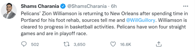 鹈鹕记者报道称锡安目前已开始完整负重训练,但还没进行场上训练。初步计划是锡安暂时不会随队出征客场比赛,他将继续留在新奥尔良恢复,主场比赛他会出现在替补席。