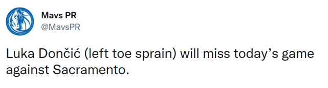 独行侠官方宣布,东契奇因为左脚脚趾伤势将缺席今天与国王队的比赛。消息人士透露,东契奇的伤势并不严重。他预计只需要休战一场比赛而已。赛季至今,东契奇场均27.8分9.2篮板8.8助攻,独行侠目前38胜25负,排名西部第五。