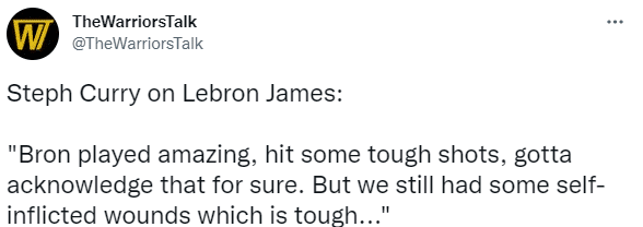 赛后库里表示:很显然,詹姆斯今晚打得非常棒,你不得不承认他命中了一些艰难的出手,但我们自身仍然存在着一些问题;安东尼表示詹姆斯今晚扛着球队赢球,里夫斯言简意赅:勒布朗就是勒布朗,那就是我能所说的;威少则表示:当詹姆斯打出这种表现时,其他球队真的无能为力!