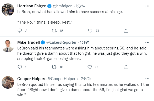 赛后回应本场轰下56分,詹姆斯借用对队友说的话,表示:现在我根本不在乎 56分。我很高兴我们赢了……我们几乎需要所有的人来对抗一支进攻端极具爆发力的球队(勇士)。