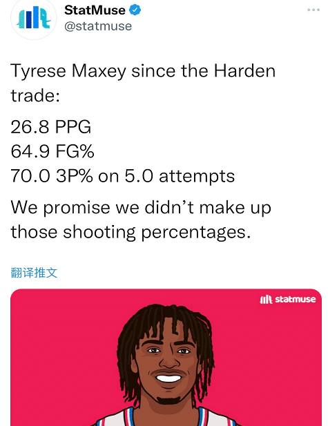 同时哈登还和另外“两大巨头”创纪录:恩比德、哈登、马克西配合出战的前4场比赛中,三人每场比赛的得分均为20+。这是NBA历史首次有三人组达成该数据。