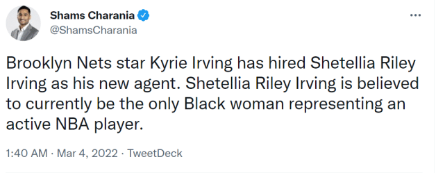 据名记查拉尼亚报道,消息人士透露,篮网后卫凯里-欧文聘请继母谢特莉亚-莱利-欧文担任自己的新经纪人。据悉,谢特莉亚成为现役球员经纪人中唯一的黑人女性。