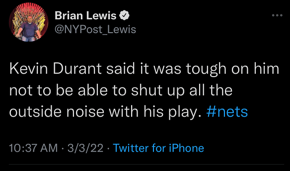 杜兰特复出,接受采访的时候,他谈到了自己因伤缺席的这段时间,杜兰特称:受伤期间不能通过出战比赛来消除外界的质疑,这样的感觉糟糕透了。
