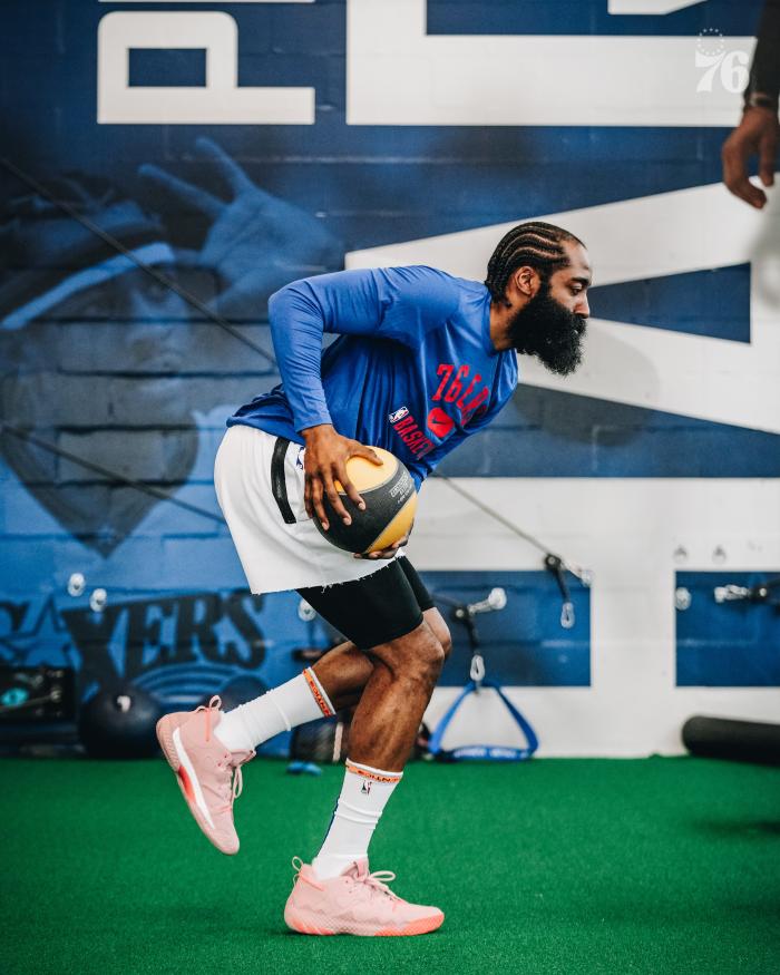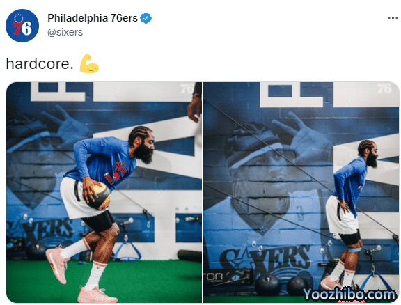 76人官方晒出哈登训练照,晒照并且配文写到:硬核(秀肌肉表情);哈登身穿76人训练服,专注于苦练核心力量,貌似变瘦了,似乎大肚腩也消失不见了;背景中的艾弗森十分醒目,这是艾弗森最经典的倾听全场的庆祝动作。