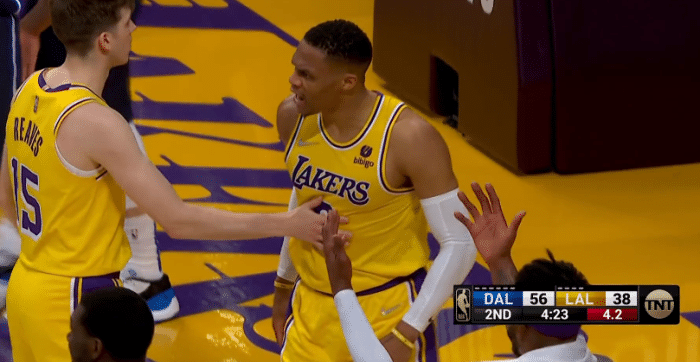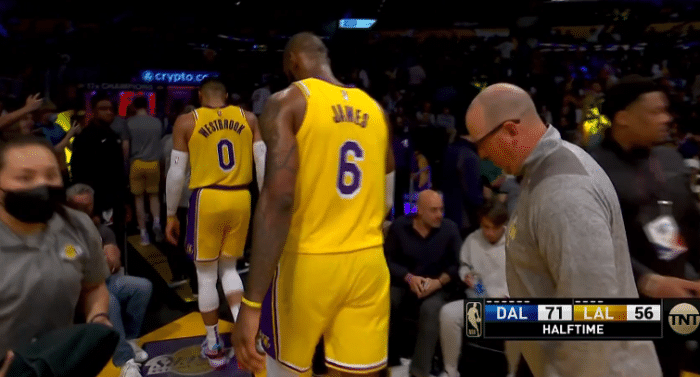 首节比赛,湖人25-30落后5分,詹姆斯第一节的心情很轻松,镜头拍到老詹咧嘴大笑,可第二节湖人彻底被打爆,进攻哑火防守犹如纸糊一般,独行侠外线三分没人防,一对一单防也被一步过掉;湖人落后到将近20分,第二节4分23秒,威少不满判罚,冲裁判握拳咆哮吃T,沃帅为威少出头也吃T,詹姆斯也找裁判讨说法。