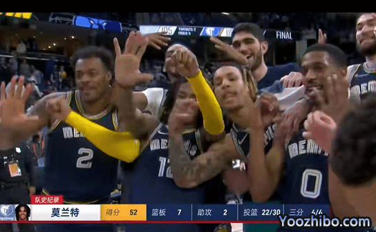 对手此时也被打懵了,马刺全明星球员穆雷在莫兰特制造犯规后,直接拿球砸裁判,遭到驱逐!赛后,莫兰特也招呼所有队友一起合影留念,他们伸出5根手指,寓意莫兰特拿下了52分。这支青年军的氛围,的确令人羡慕。