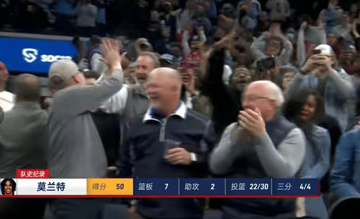 比赛最后时刻完全成为莫兰特一个人的表演时间。他连续冲击内线得分,将自己的个人得分不断刷新。最终,莫兰特将自己的个人得分锁定在52分!当莫兰特拿到第50分打破队史纪录后,全场球迷也已经按捺不住激动,纷纷起立为他欢呼。之后莫兰特站上罚球线后,现场响起震耳欲聋的MVP呐喊声。