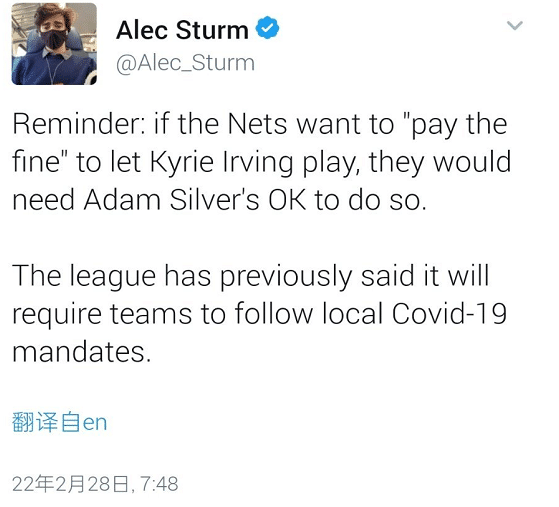 2月28日,有记者针对缴纳罚款出场比赛进行解读,称如果欧文想支付罚款打球,必须要得到NBA总裁的点头允许,联盟之前就指示各队遵守当地的防疫政策。