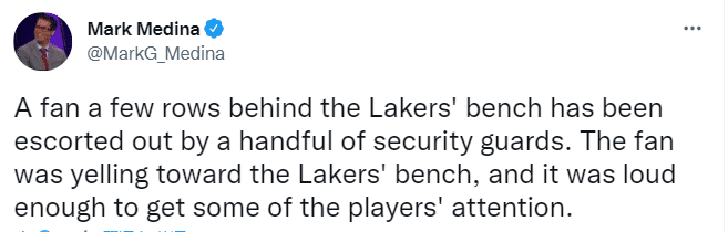 末节,詹姆斯不放弃,继续带队追分,无奈湖人挖坑太大,最终老詹只能提前放弃比赛,比赛还剩4分33秒,沃格尔换下主力,比赛彻底沦为垃圾时间;詹姆斯尽力了,但球队耻辱惨败;由于湖人球迷十分生气,坐在湖人替补席后面的几名球迷出言不逊被保安请出球馆。