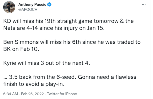 对于篮网来说,要想不打附加赛,他们得尽快调整好状态,多拿下一些胜利了。篮网记者Puccio谈到了球队目前的处境。他在社媒上写道:“杜兰特明天将连续缺席第19场比赛,自从他受伤以来,篮网的战绩是4胜14负。本-西蒙斯自从被交易到篮网后,将连续缺席第6场比赛。欧文未来4场有3场不能出战,篮网要重回东部第6,还差3.5个胜场,他们需要完美地表现才能躲开附加赛了。”
