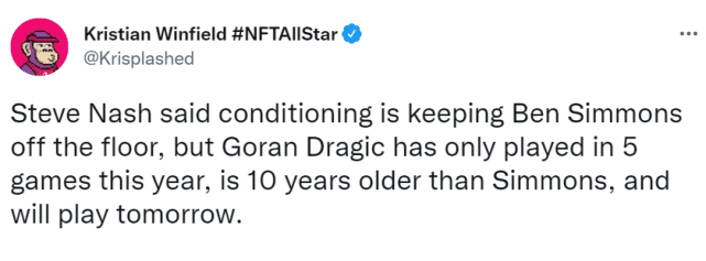 前一段时间的连败,让篮网的排名一路下滑,而球迷们最关心的不仅仅在于欧文何时能够成为全职球员,还在于西蒙斯到底什么时候才能上场。按理说,从76人来到篮网,西蒙斯应该高兴了,为什么还不能上场呢?篮网主帅纳什给出了解释:“体能问题,”纳什说,“我们要尝试让他回到原来的位置上……毕竟他休战了很长一段时间,对吧?他有太长时间没打NBA比赛, 现在要通过训练让他适应。”