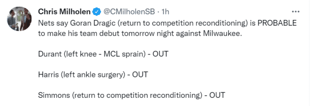 篮网官方公布了明天对阵雄鹿的伤病名单:德拉季奇的状态升级为probable(大概率出战,上场可能75%),杜兰特、哈里斯和西蒙斯继续缺阵。随后,篮网记者Winfield透露,德拉季奇明日将会出战,迎来篮网生涯的首秀。篮网官方也晒出了德拉季奇身穿9号球衣的定妆照,为他的首秀预热。