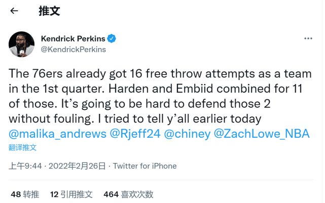 尽管恩比德单节只命中一个运动战进球,但凭借8次罚球仍然砍下10分6板,76人全队则是单节罚了16次。评论员帕金斯发推写道:哈登和恩比德首节加起来罚球11次,不犯规是很难防住这两人的,我今天早些时候就告诉过你们了。